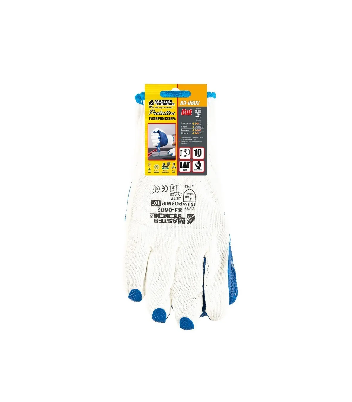 Rukavice pracovné MASTERTOOL 83-0602 z bezšvovej pletenej bavlny s prírodným latexovým povrchom biela/modrá 10,5"